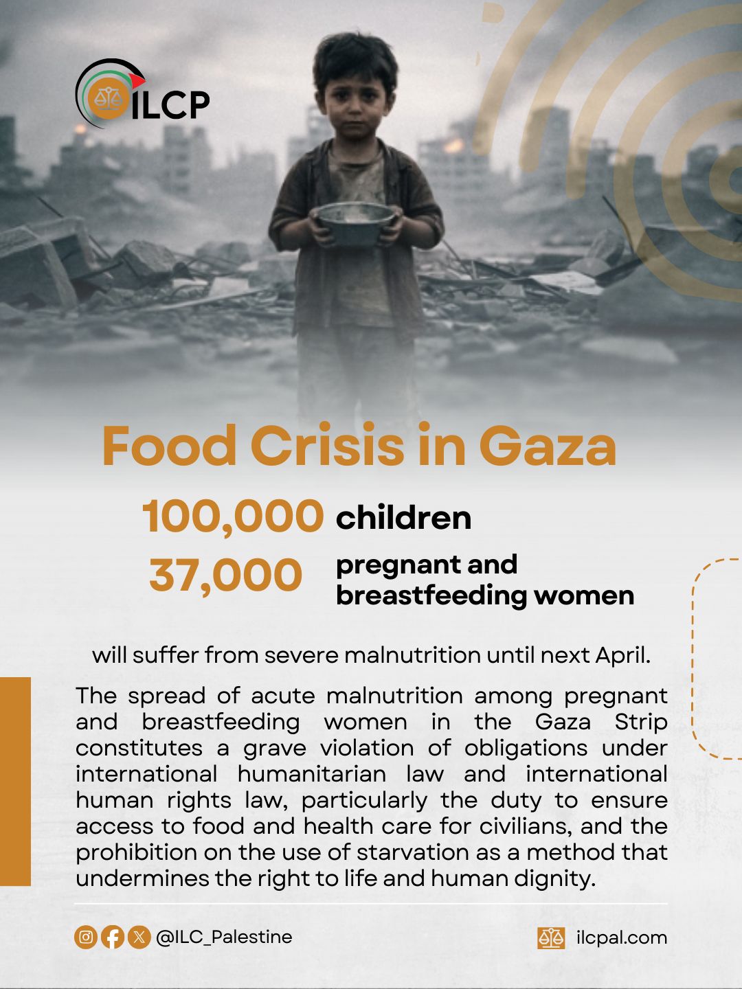 The spread of severe malnutrition among children and pregnant and breastfeeding women in Gaza constitutes a grave breach of international humanitarian law and international human rights law, including the obligation to ensure access to food and health care for civilians and the prohibition of starvation as a method that violates the right to life and human dignity
