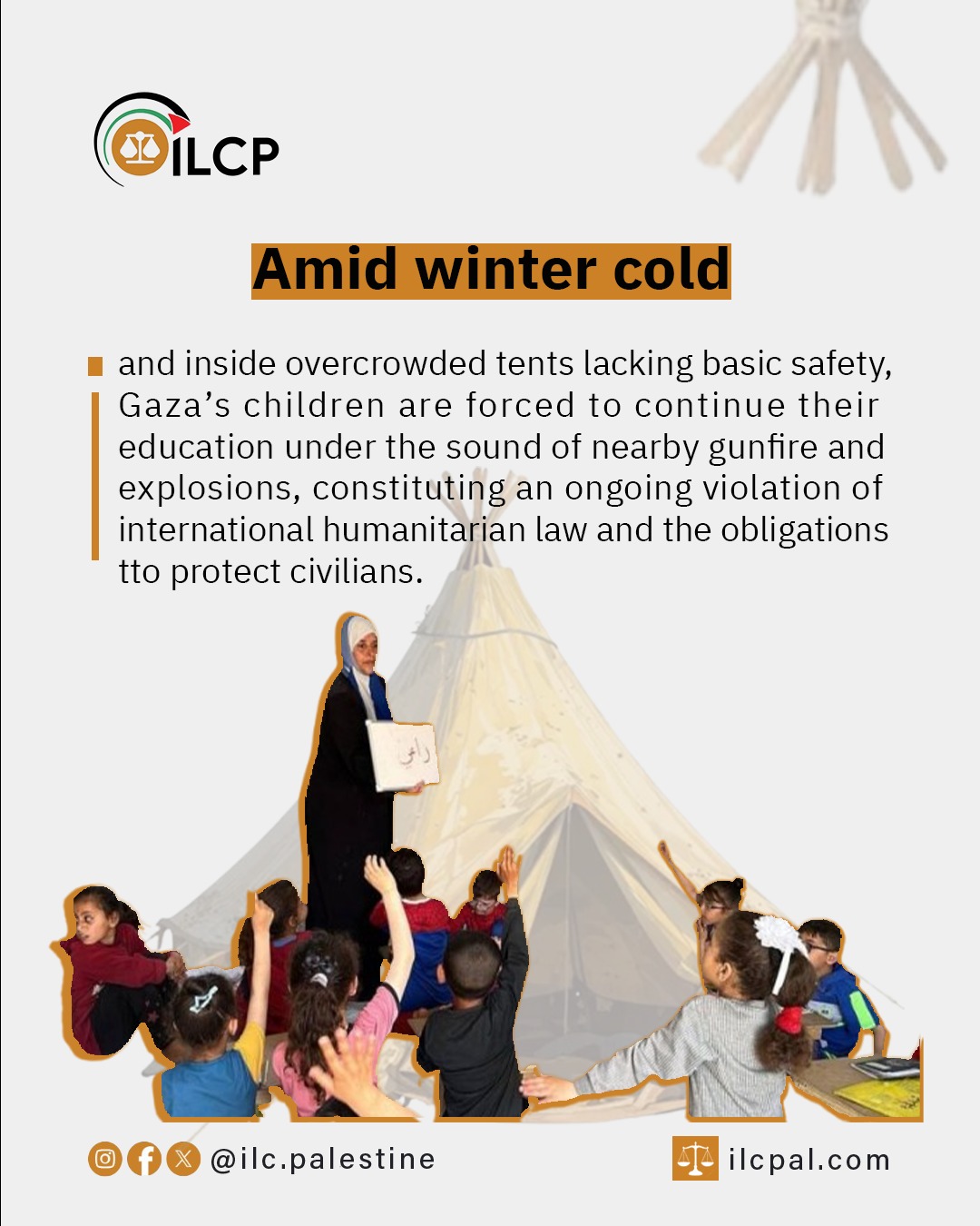Gaza’s children study amid cold, overcrowded tents, and nearby hostilities—an ongoing violation of international humanitarian law and the duty to protect civilians and education